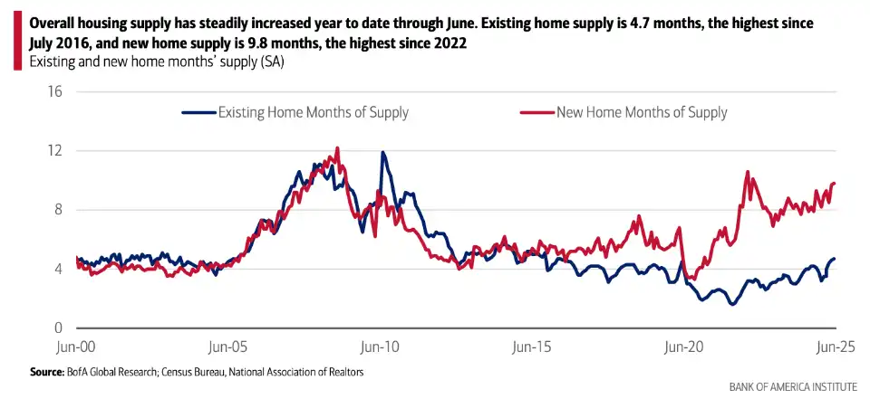 The U.S. housing market’s inventory is growing, putting pressure on prices and slowing new construction, according to fresh research from the Bank of America Institute. As of June, existing-home supply reached 4.7 months, the highest level since July 2016. New-home supply surged even further to 9.8 months—its highest point since 2022—highlighting how quickly inventory is building across the housing market.